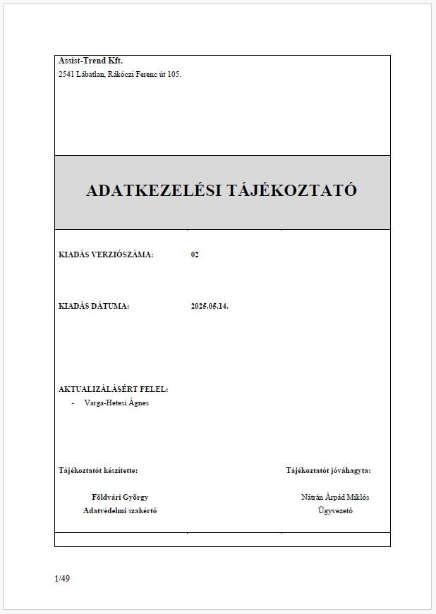 Az Assist-Trend Korlátolt Felelősségű Társaság (a továbbiakban: Assist-Trend Kft., vagy Adatkezelő, vagy Adatfeldolgozó), melynek Székhelye: 2541 Lábatlan, Rákóczi Ferenc út 105. Adatkezelés helyszíne: megegyezik a székhely címével, Adószáma: 13576114-2-11, Központi E-mail címe: info@assist-trend.hu, Weboldala: https://www.assist-trend.hu/ az információs önrendelkezési jogról és az információszabadságról szóló 2011. évi CXII. törvény (a továbbiakban: Infotörvény), valamint az Európai Parlament és a Tanács 2016. április 27-ei (EU) 2016/679 rendelete (a továbbiakban GDPR rendelet) alapján előírt kötelezettségének eleget téve megalkotja adatkezelési tájékoztatóját (a továbbiakban: Tájékoztató). Az Assist-Trend Kft. megbízott adatvédelmi felelőse és annak elérhetősége: Varga-Hetesi Ágnes adatvedelem@assist-trend.hu
