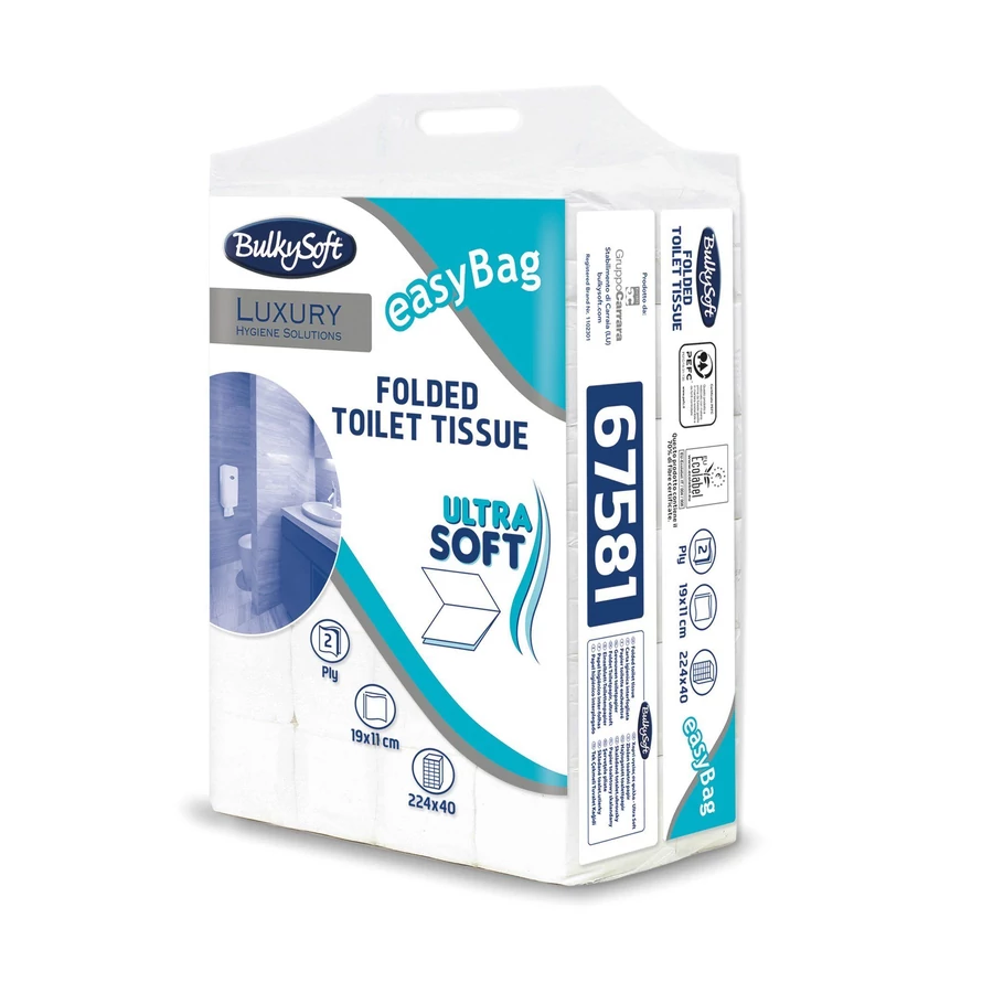 Magas minőségű, két rétegű, fehér, 100 % cellulóz környezetkímélő V hajtogatott toalettpapír. Easy bag, hordfüles termék.EcoLabel tanúsítvánnyal rendelkezik, használata támogatja az ESG irányelveket.