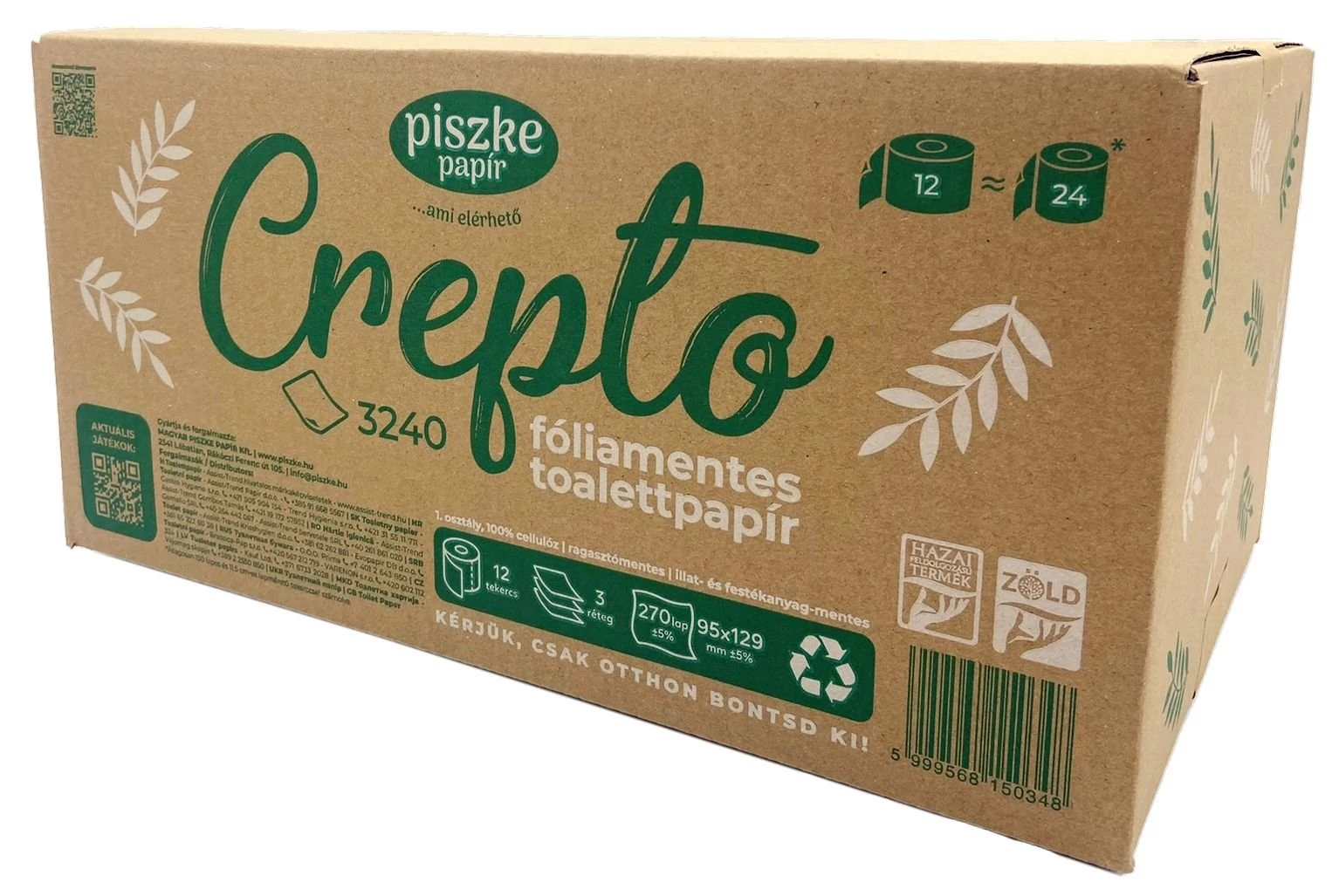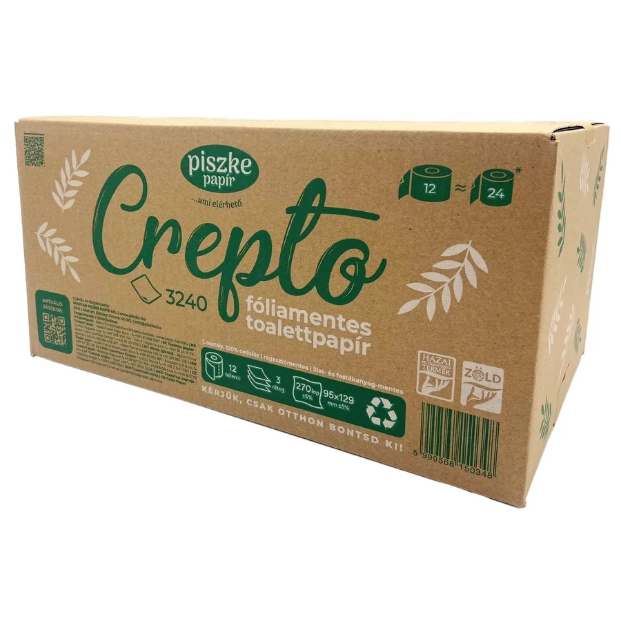 A Crepto 3240 fóliamentes toalettpapír 12 olyan kompakt tekercset tartalmaz papírdobozba csomagolva, mely megfelel 24 átlagos tekercs papírméretének. A termék kis mérete és könnyű hordozhatósága ellenére is elegendő egy négytagú háztartás egy havi higiéniai papír igényének kiszolgálására. Védje környezetét, vásároljon hazai, terméket!