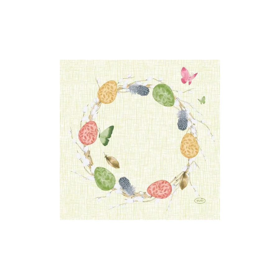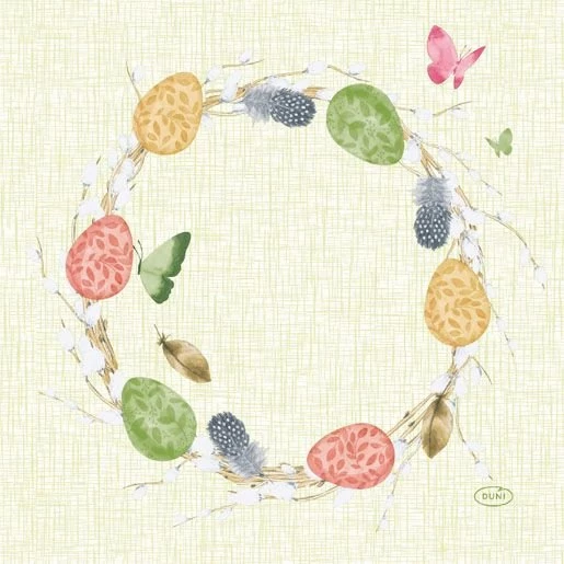 Három rétegű, húsvéti mintás tissue szalvéta a Duni kínálatából. FSC minősítéssel rendelkező, környezetbarát termék, használata támogatja az ESG irányelveket.