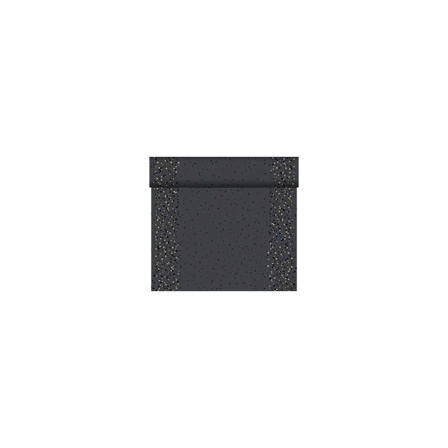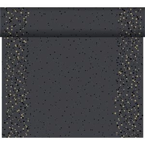 A Golden Stardust Black asztali futó exkluzív megjelenést kölcsönöz a terítéknek, extra puhaság, és textil hatás jellemzi. Tökéletes választás, ha nem szeretné, hogy az asztalok teljesen le legyenek fedve. Környezetbarát alapanyagú, FSC minősítésű. Használata támogatja az ESG irányelveket.
