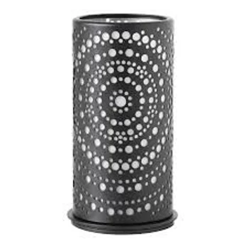 Fekete színű, áttört mintás gyertyatartó, amely a led égőkkel változatos színekben díszíti a terített asztalt.