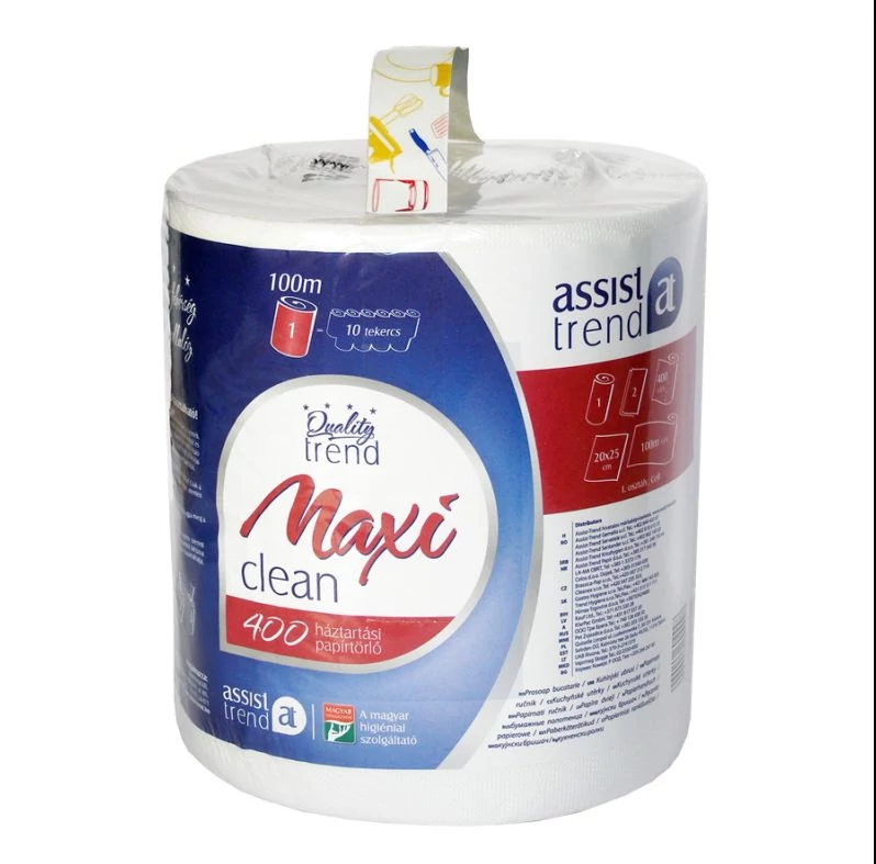Belsőmagos tekercselésű kétrétegű környezetkímélő törlőpapír, mely egy tekercsen 400 lapot tartalmaz A Maxi Clean törlőpapír egy tekercsen 100 m papírt tartalmaz.