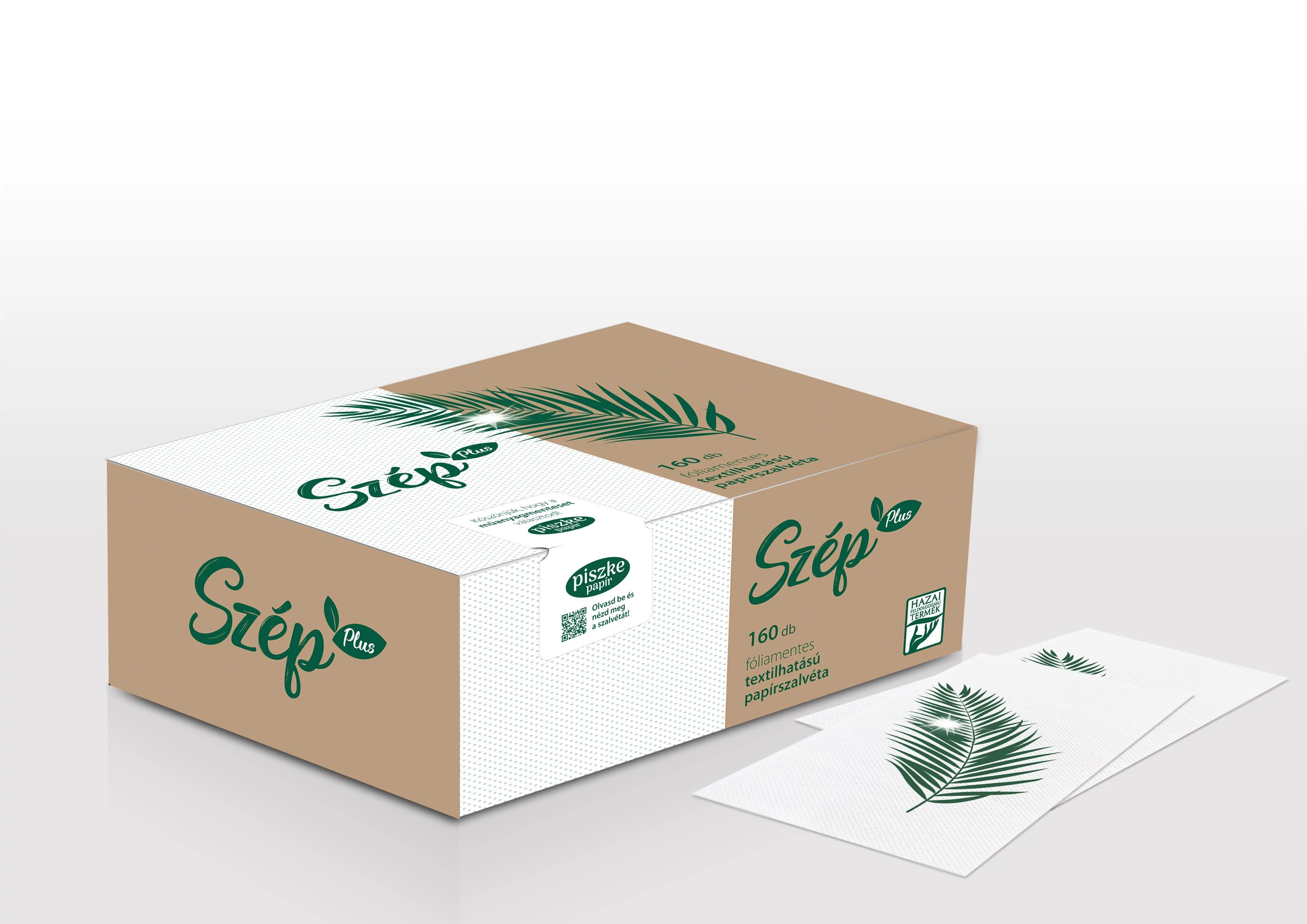 Fóliamentes ökoszalvéta a Magyar Piszke Papír Kft.-től. Nagy kiszerelésű, környezetbarát fehér szalvéta, 2 rétegű, 100% cellulóz alapanyagból készült környezetbarát termék, FSC minősítéssel rendelkezik, használata támogatja az ESG irányelveket.
