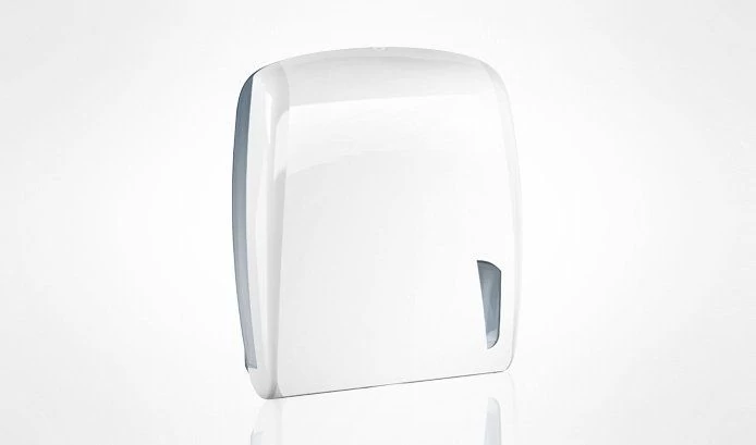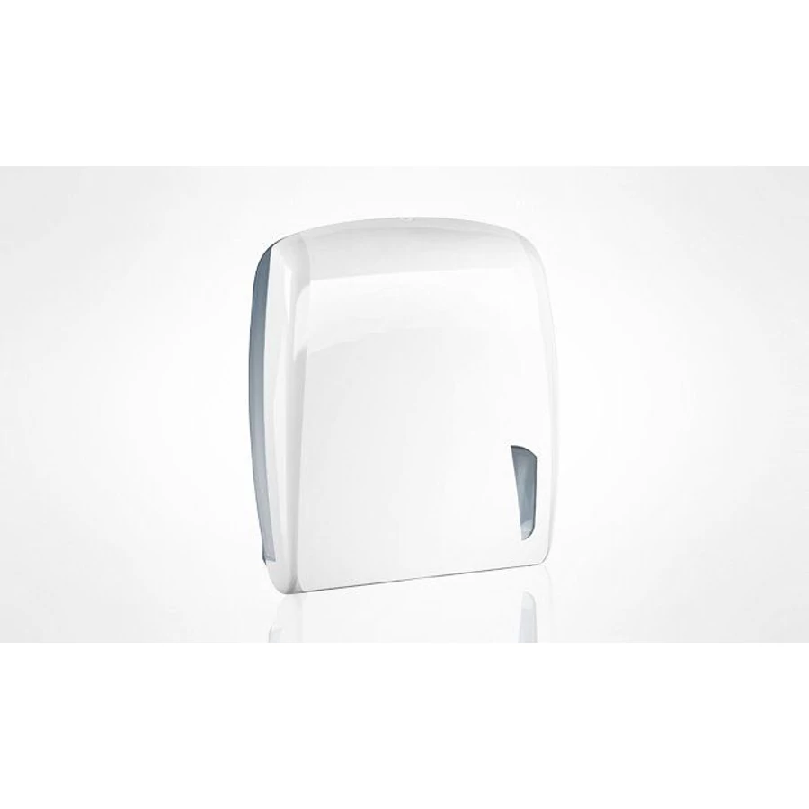 Újrahasznosított anyagból készült falra szerelhető hajtogatott kéztörlő adagoló, Z és C hajtogatású kéztörlőkhöz. Az adagolóba maximum 450 szál törlőpapír helyezhető. Közösségi mosdóhelyiségekbe ajánlott.