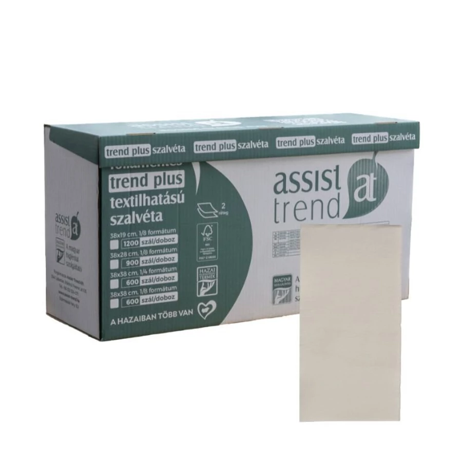 Nagy kiszerelésű, 2 rétegű, 1/8-os formátumú textilhatású szalvéta peszgő színben. Praktikus, visszazárható, fóliamentes doboza megvédi a szalvétát és egyben környezetünk védelméhez is hozzájárul. FSC minősítésű, környezetbarát alapanyagú, használata támogatja az ESG irányelveket.