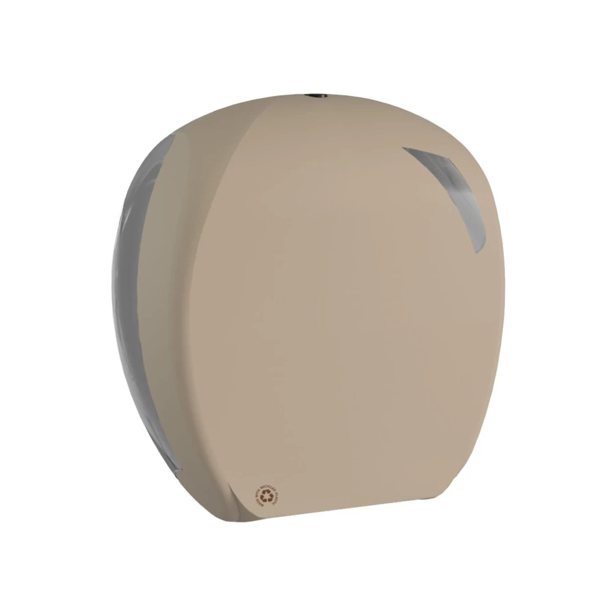 Újrahasznosított műanyagból készült maxi toalettpapír adagoló homok színben. Könnyen tisztítható. Használata támogatja az ESG irányelveket.