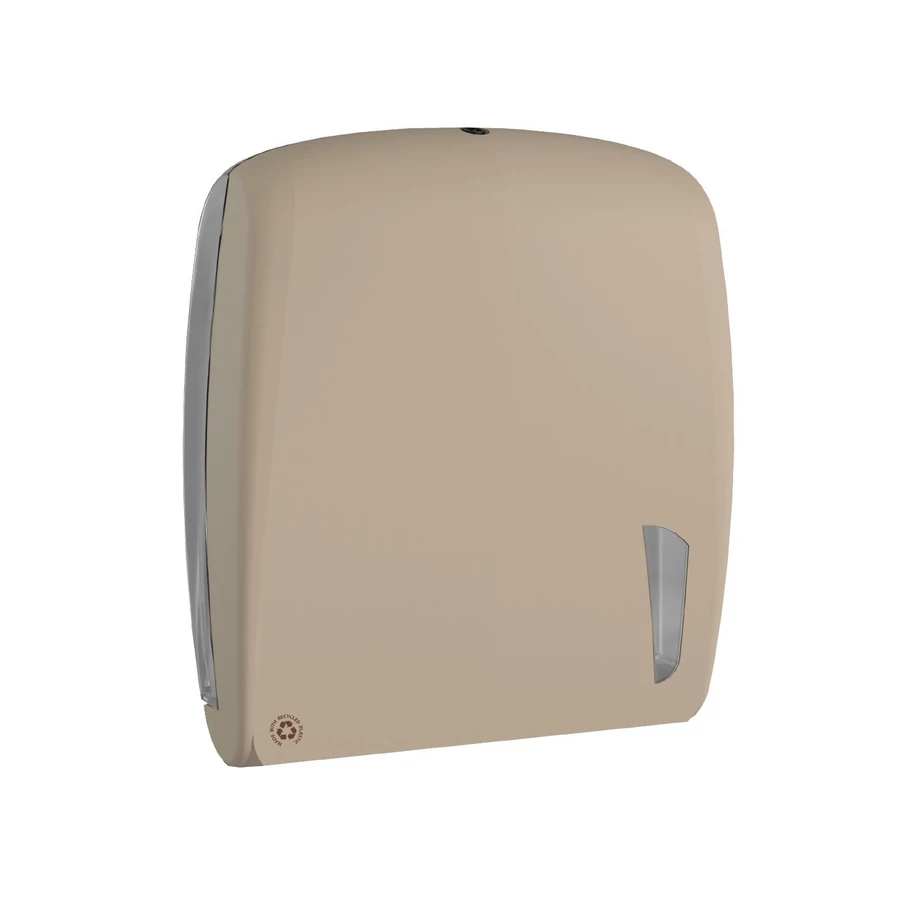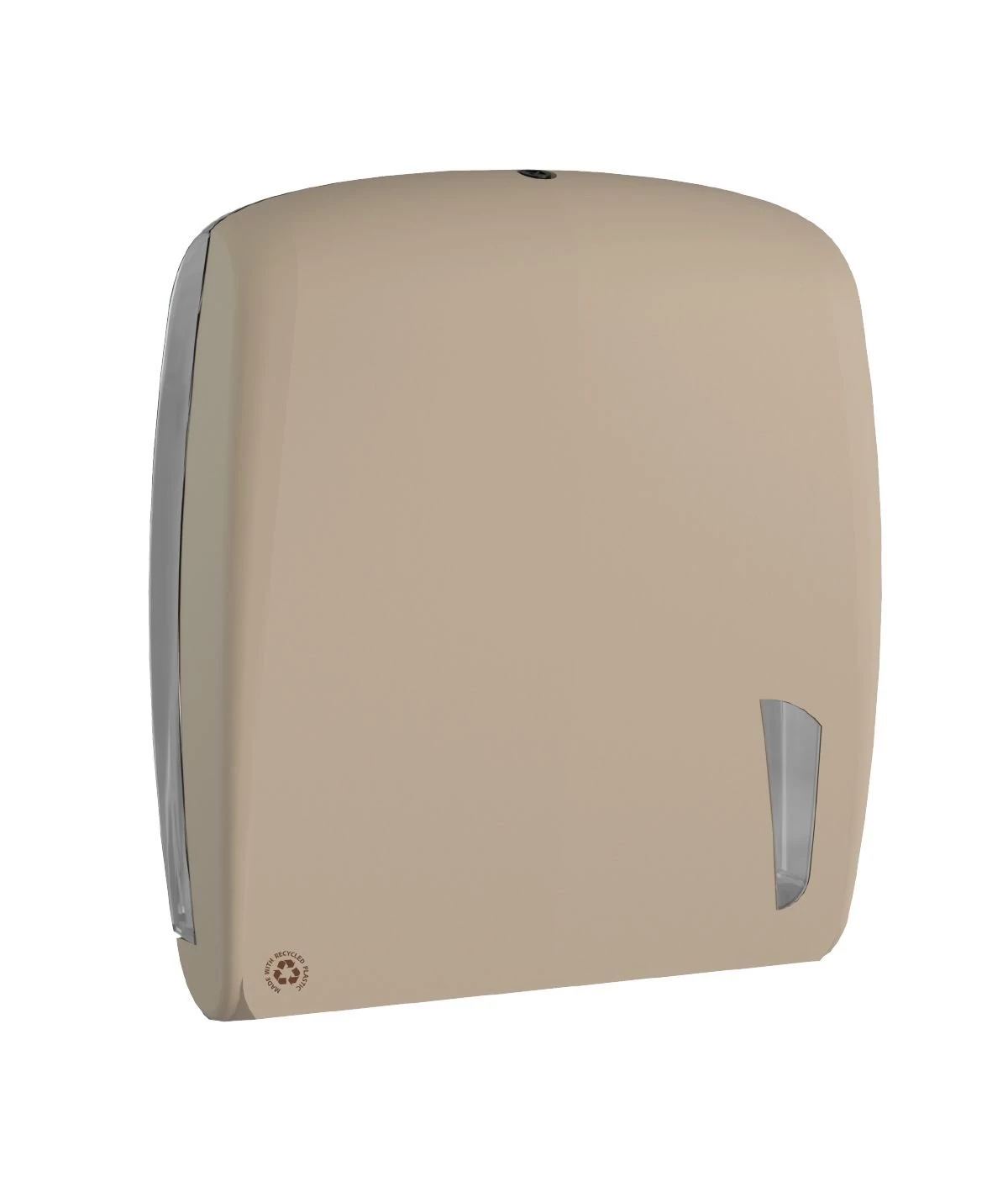 Újrahasznosított műanyagból készült, Z-C hajtogatású kéztörlőhöz való adagoló homok színben. Töltet kapacitása: 450 lap. Használata támogatja az ESG irányelveket.